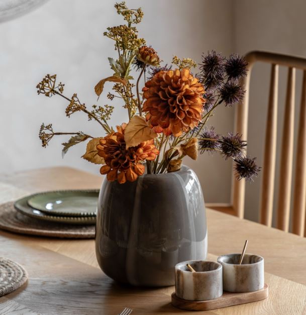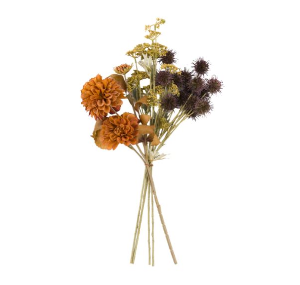 Bundled in a Kraft paper wrapping this bunch of faux flowers will set the autumnal tone in any room. The beautiful mix of rust red and orange flowers are bursting with detail and a realistic feel.