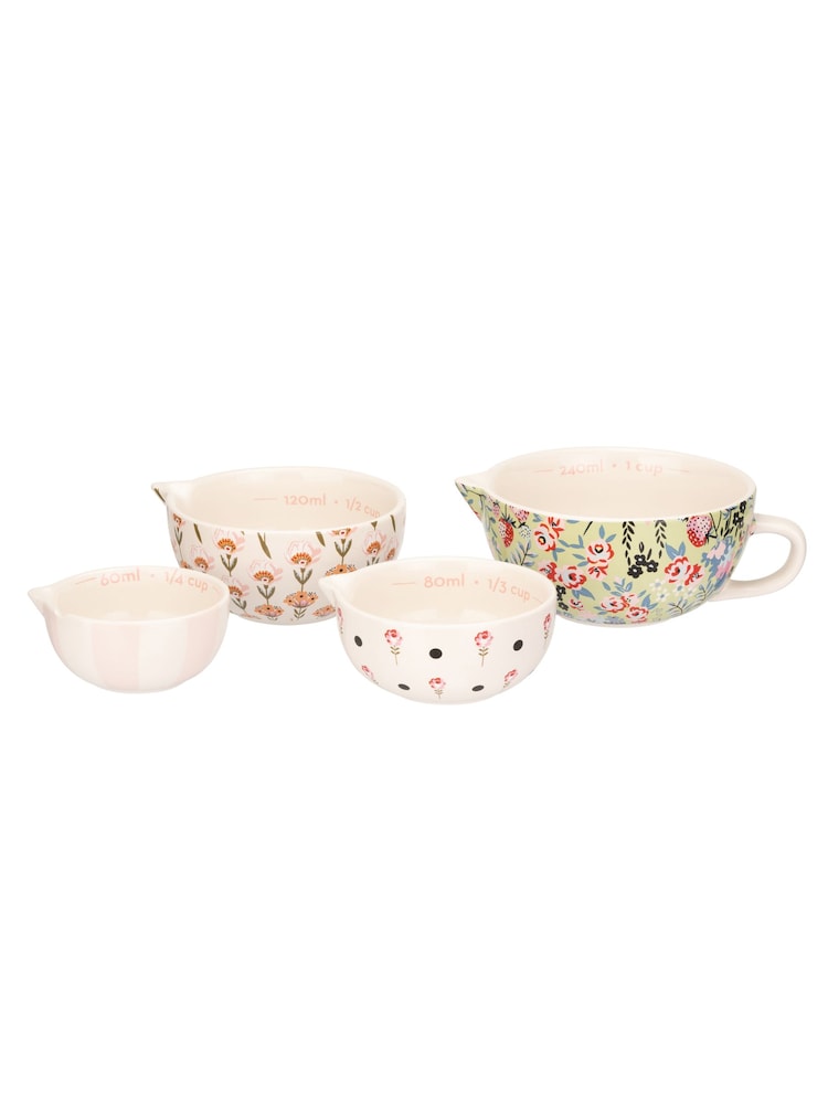 Discover the sweet journey of baking with the our Painted Table Set of Measuring Cups and Measuring Spoons. The measuring cups are a traditional teacup shape with a mix-and-match pairing of painterly florals and modern graphics.