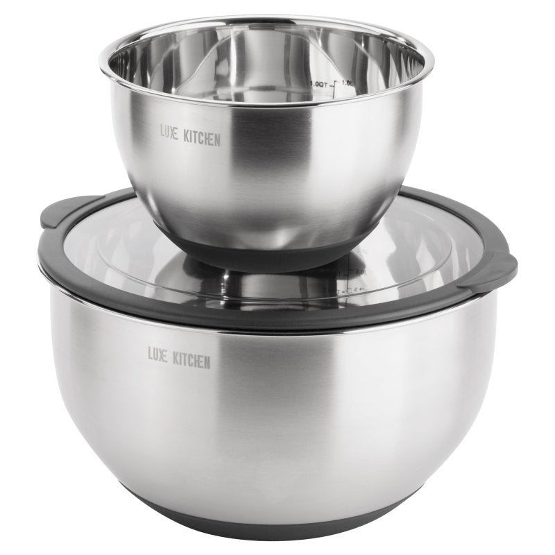 Featuring non-slip bases and leak-proof lids, the Luxe Set Of 2 Stainless Steel Mixing Bowls nest for easy storage and come in handy 16cm and 24cm sizes. Perfect for all your mixing, storing, and organising needs.