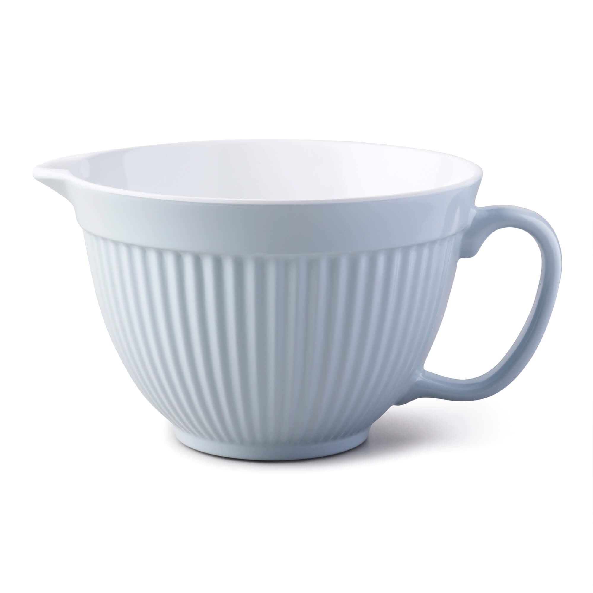 Featuring a pouring lip, detailed ribbed outer and a generous handle it is the perfect shape and size for blending, beating, kneading, whipping, whisking and folding. The classic white interior allows you to clearly see the tone and texture of the mixture.