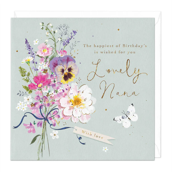 Surprise your Lovely Nana on her special day with our delightful birthday card. Adorned with a charming floral design and a graceful butterfly, this card creates a visually enchanting backdrop for your warm wishes. Enhanced with touches of gleaming gold foil, it adds an extra layer of elegance to your heartfelt message. Make her birthday truly special with this beautifully crafted and uniquely designed greeting, a perfect expression of love and celebration for your Lovely Nana.
