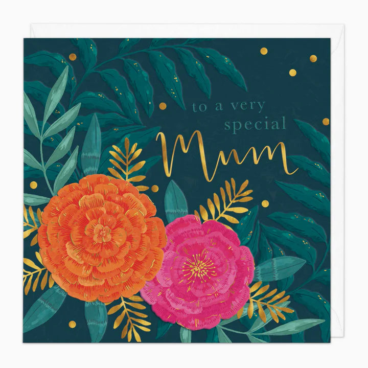 Two bright flowers, one a warm orange and the other a vibrant pink, stand out against a backdrop of deep green leaves. It’s a special card for a special mum, with gold accents that add a touch of sparkle.