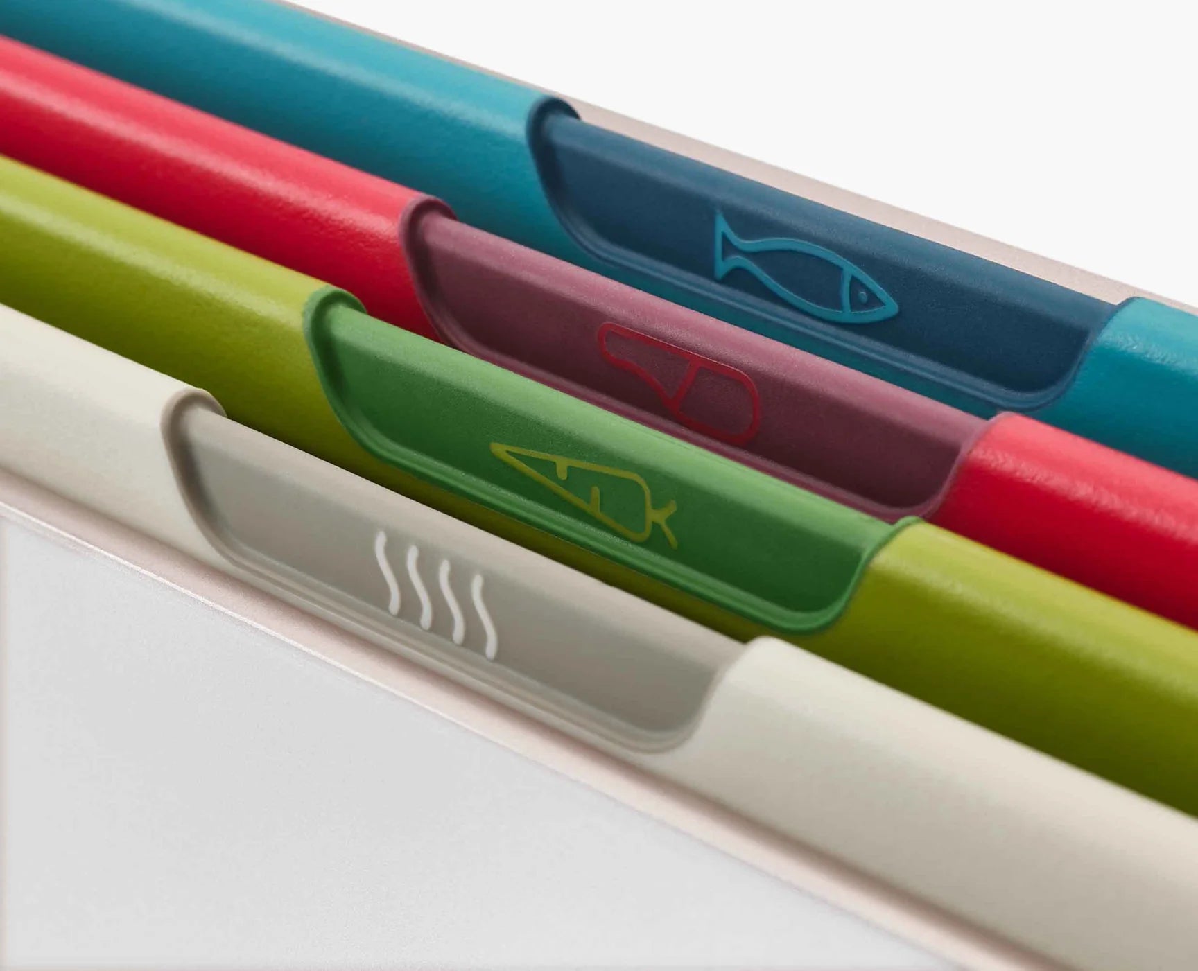 - Colour-coded boards with icons indicating which food type they should be used for - raw meat, raw fish, vegetables or cooked food