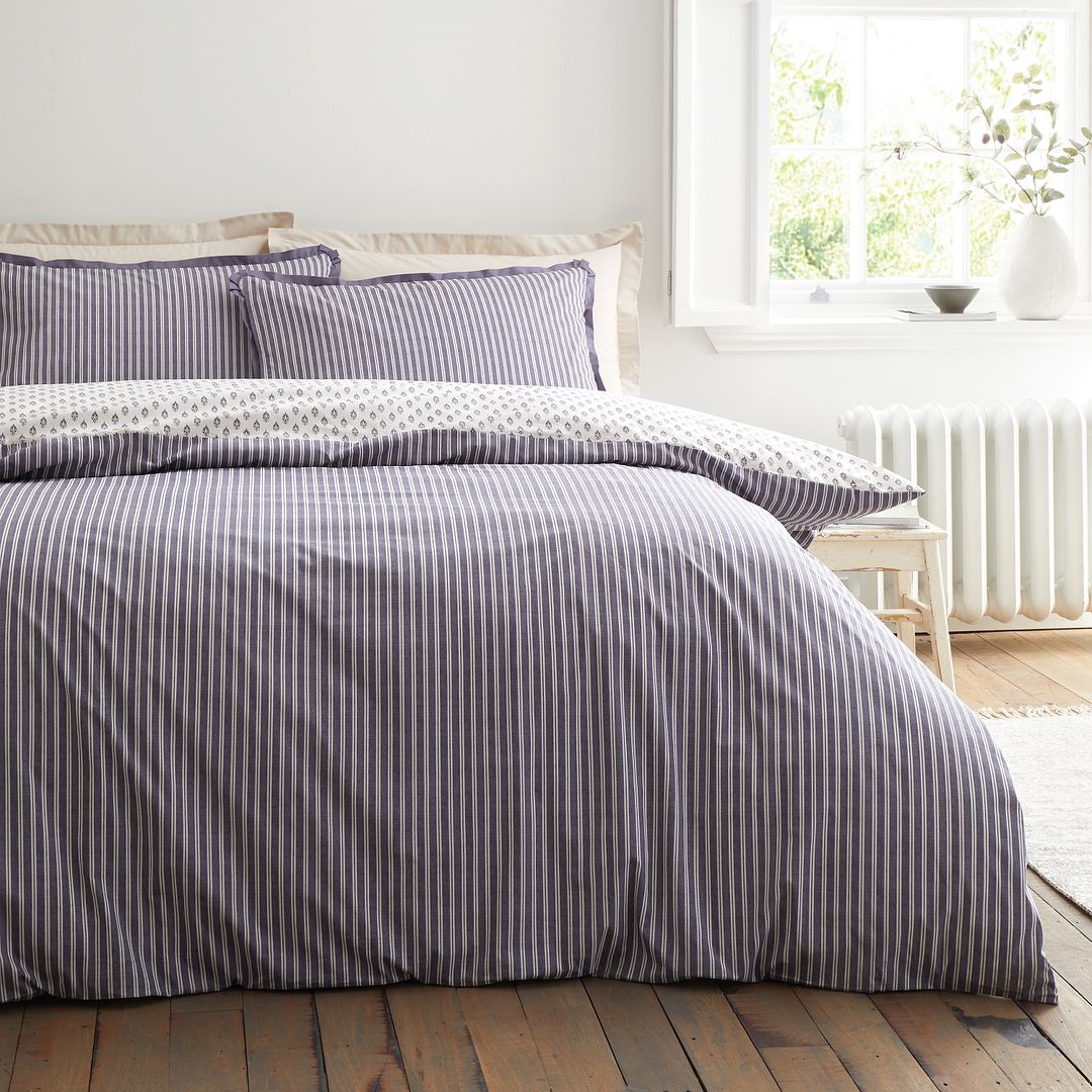 "Subtle yet refined, this design blends timeless pattern with gentle texture. Featuring a delicate geometric print in blue tones and a contrasting stripe on the reverse offering effortless versatility. Accented with a fine piped detail with corner pleats, adding a touch of elegance to the design. Dream in blissful comfort under wonderfully soft 200 thread count percale cotton, a beautiful naturally breathable fibre that encourages a better night’s sleep. Bianca evokes a sense of well being and relaxation perfect for creating a calming retreat with timeless styling for the modern home. Made to quality and human-ecological safety standards, in accordance with MADE IN GREEN by OEKO-TEX®."