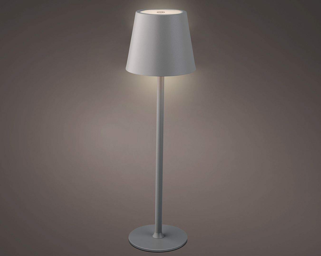 Lumineo Rechargeable Table Lamp in Modern Grey A warm glow fills the room thanks to this stylish rechargeable table lamp from Lumineo. Perfect for indoor use on the balcony, terrace, or in the garden room, the battery advantage provides ultimate ease of use without the hassle of cords. The warm, cool, and classic warm light from 48 LEDs spreads a soft, even ambiance. The lamp, made from sturdy metal, combines functionality with a contemporary look and offers up to 4.5 hours of cozy illumination. Advantages: • Rechargeable and wireless for flexible use • Variety of light colors for personalized ambiance • Sturdy metal finish for a contemporary appearance • Compact size, ideal for atmospheric table decoration