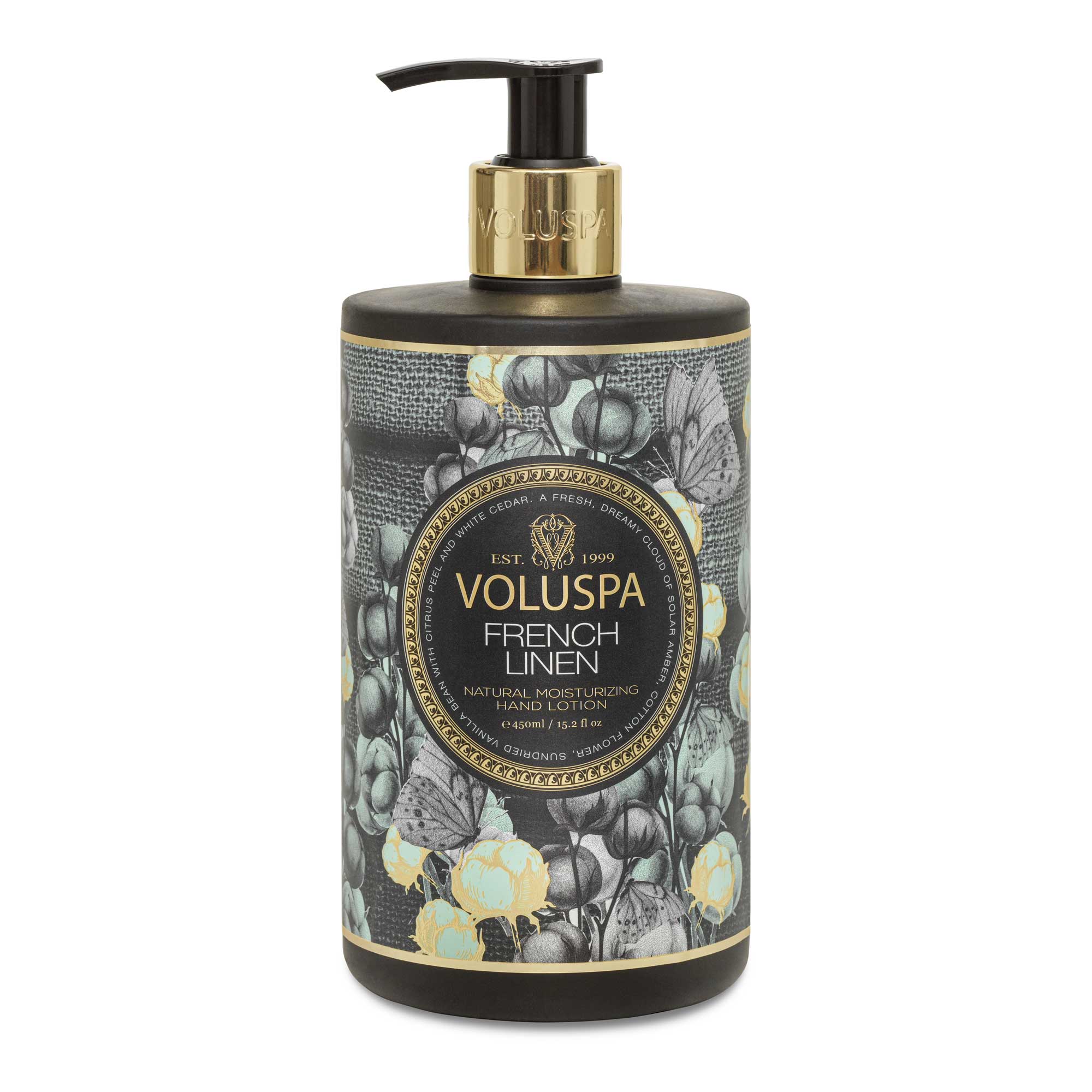 Voluspa’s Moisturizing Hand Lotion is highly covetable with its elegant frosted soft-touch finished bottle, wrapped in classic black or white Maison artwork. Pops of distinctive secondary color highlights are coupled with accents of muted gold. An added touch of luxury is also present in the custom logo, embossed on chrome gold collars on all bottle necks. Each bottle is custom designed in-house and created with Post-Consumer Recycled material. The perfect balance of beauty and function, from our house to your home.