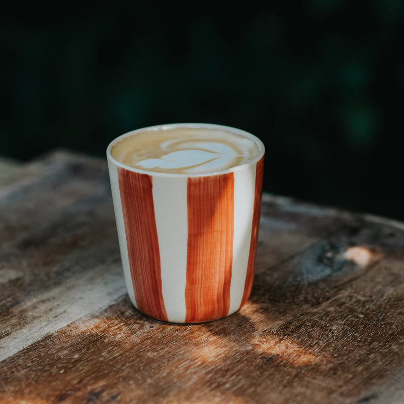Each one is hand-painted with brush-painted stripes — one solid, one with a playful broken line — giving every beaker its own personality. The smooth ceramic glaze adds a soft tactile feel, while the gently curved shape makes them a joy to hold and easy to stack.