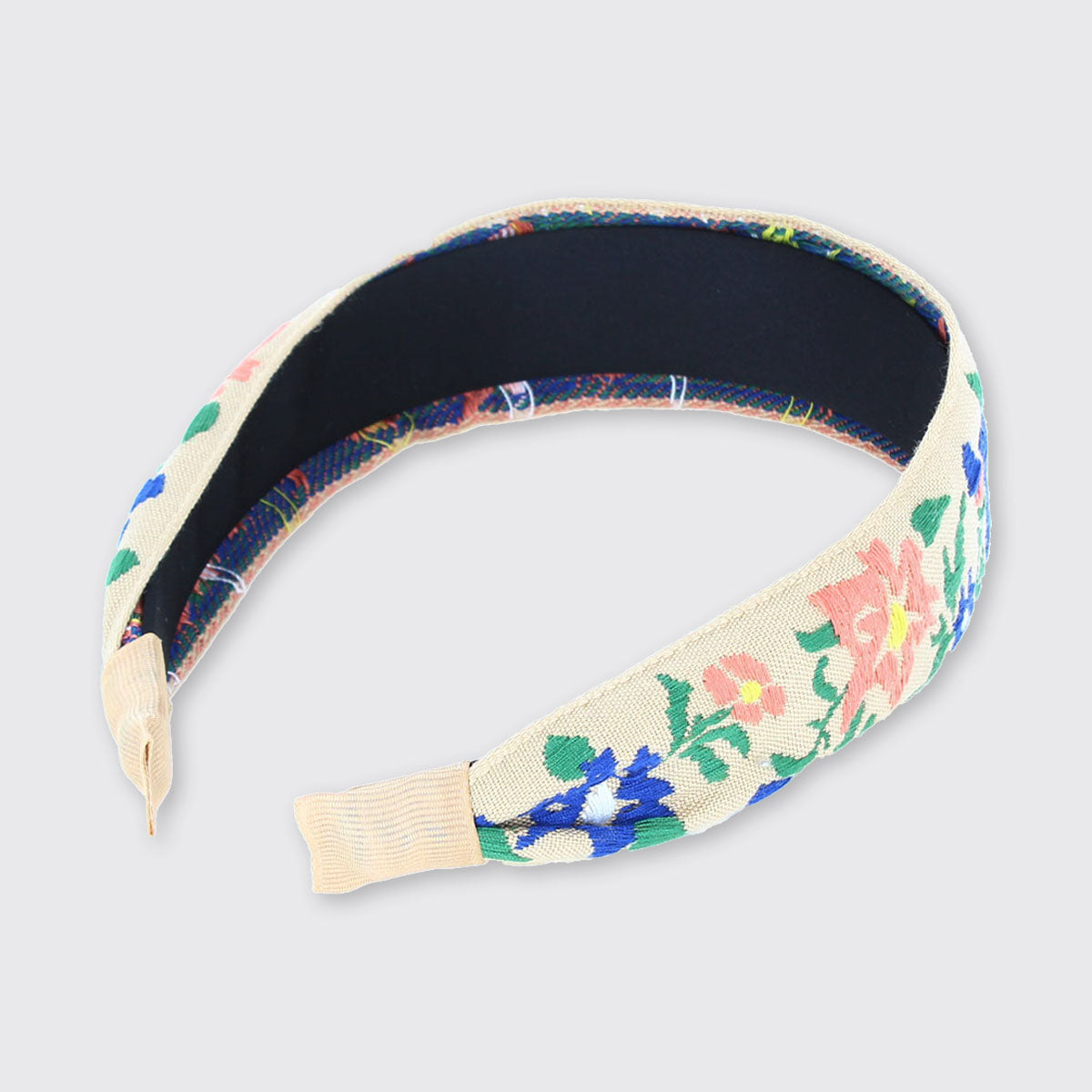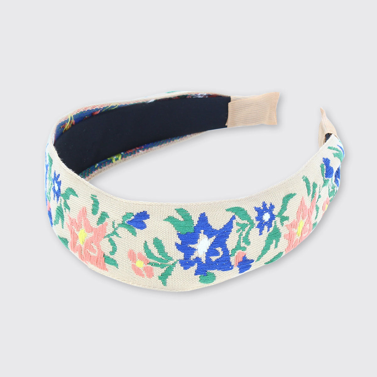 A beautiful blossom wide headband in taupe with pink, blue and green, finished with a twist knot top. Perfect for a stand out look. Our Millie Mae headbands are handmade, hold hair securely and are very comfortable to wear. Approx Size: 12.5 x 15cm Material: 100% Cotton Care Instructions: Wipe Clean