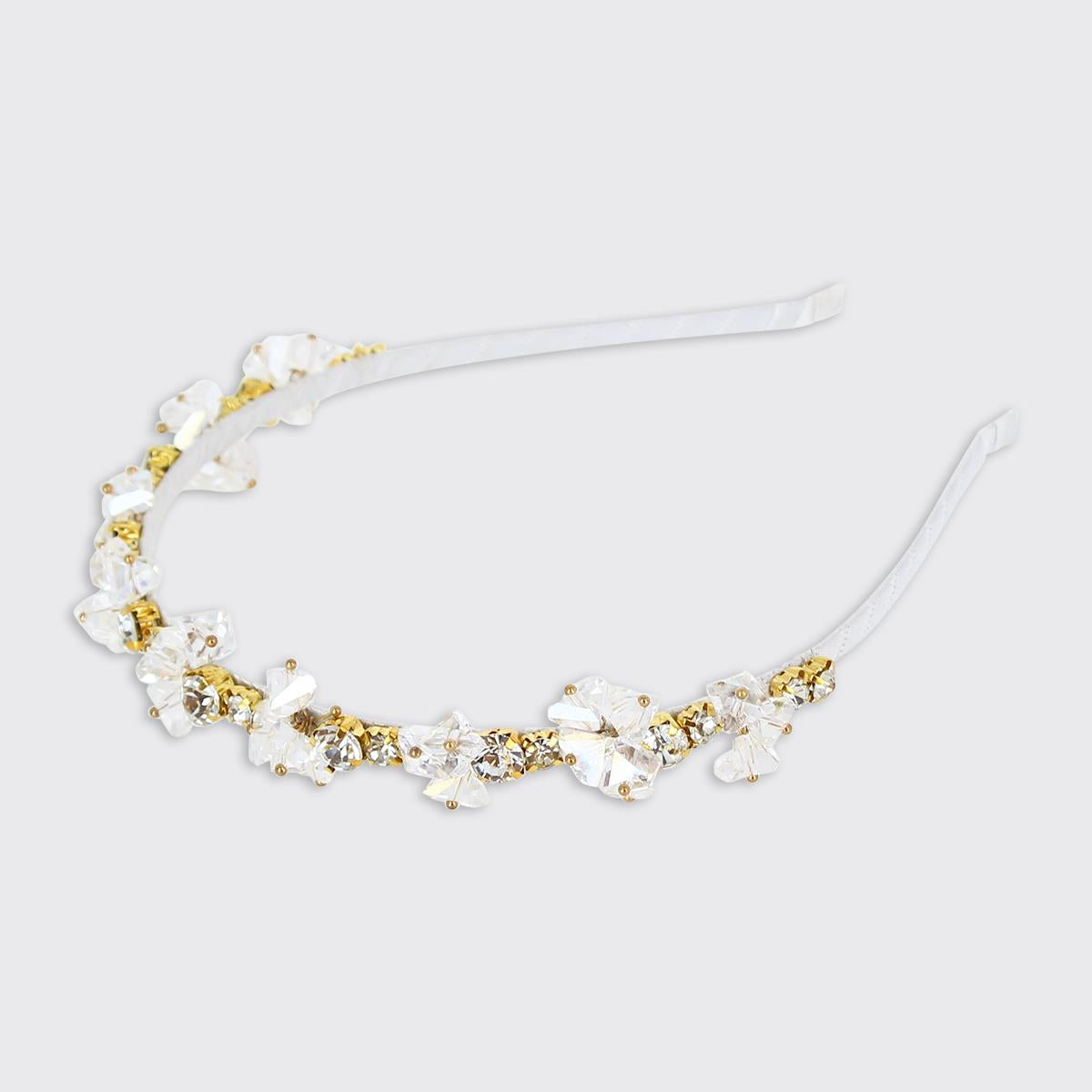 A stunning crystal headband encrusted with jewels of different sizes set in gold clasps. The slim band gives this headband a tiara-like look.