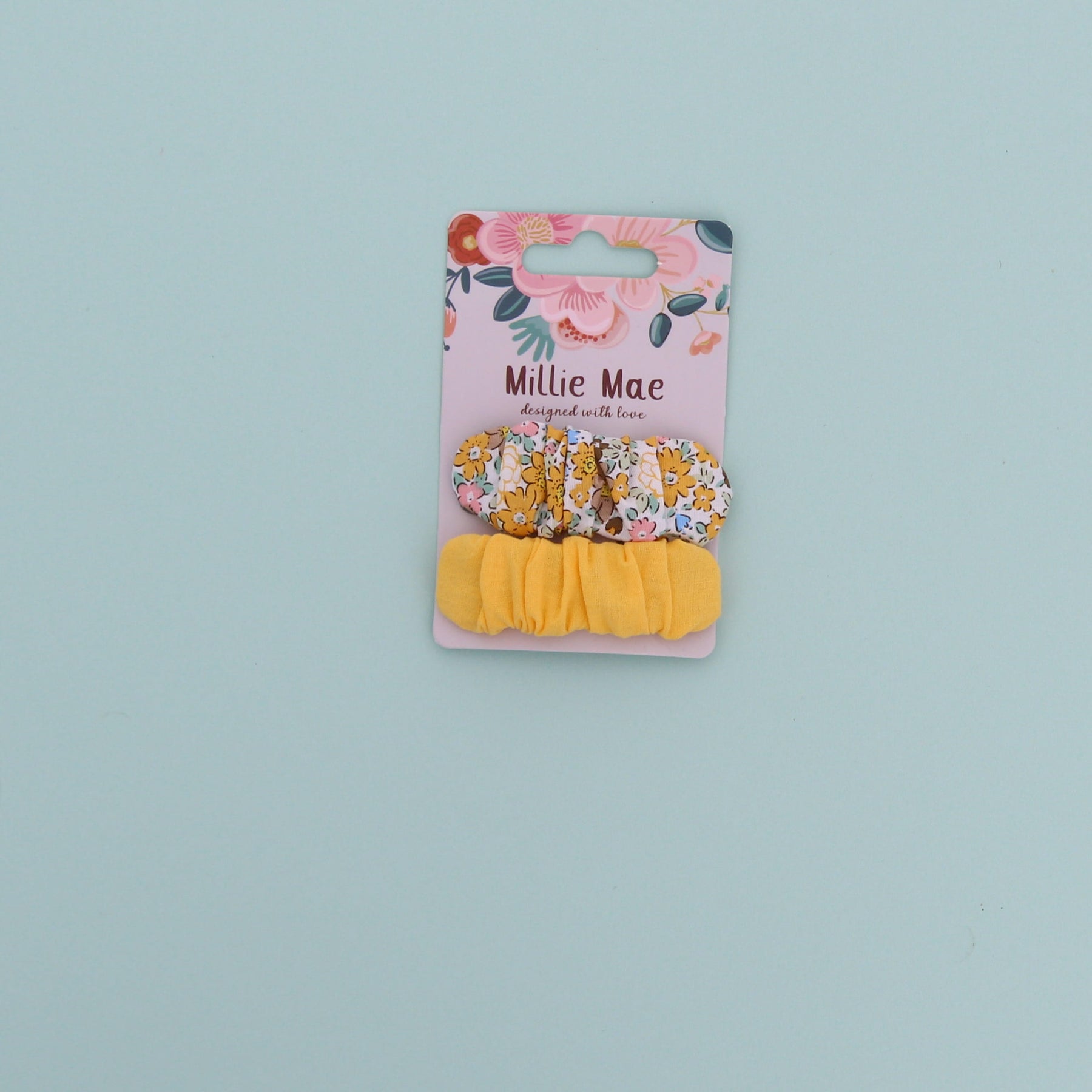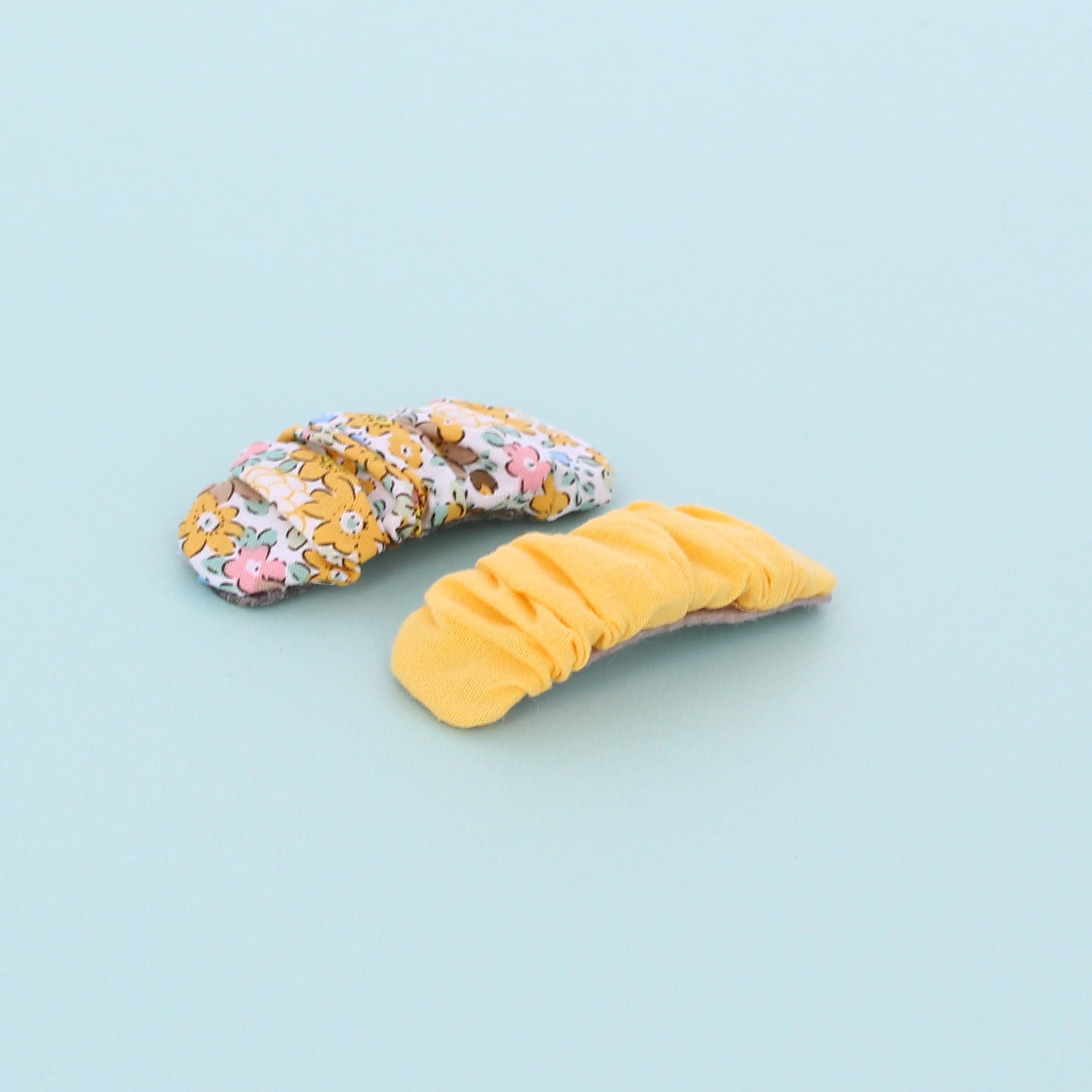 A set of cotton hair clips, one in floral print yellows and the other in plain yellow. A snap clip closure makes taking on and off a cinch. Our Millie Mae fabric hair clips are handmade, they hold hair securely, are very comfortable to wear and are highly durable.