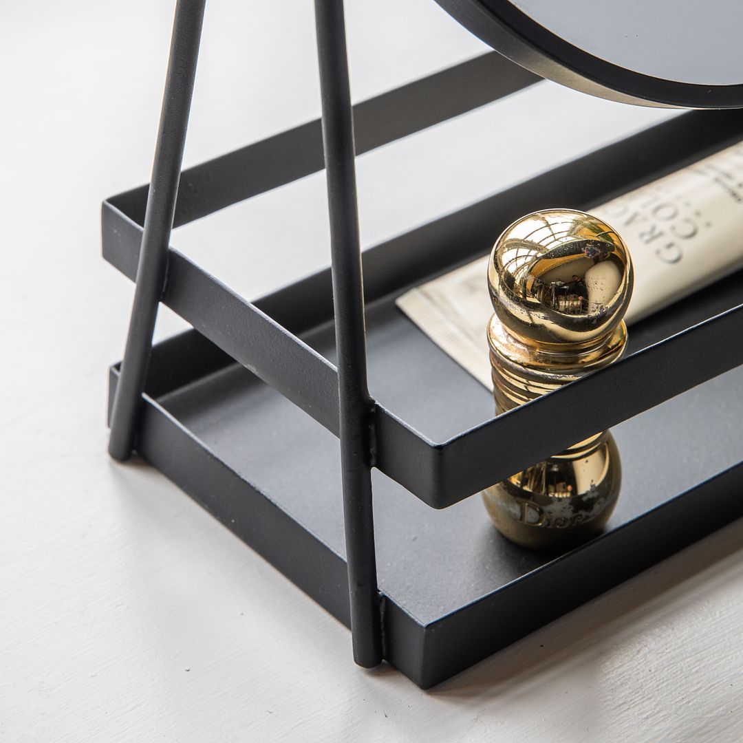 Both stylish and practical, this two sided mirror is ideal for on a dressing table or in a bathroom. It is handmade and features a black metal tray and one side of the mirror is a magnifying.