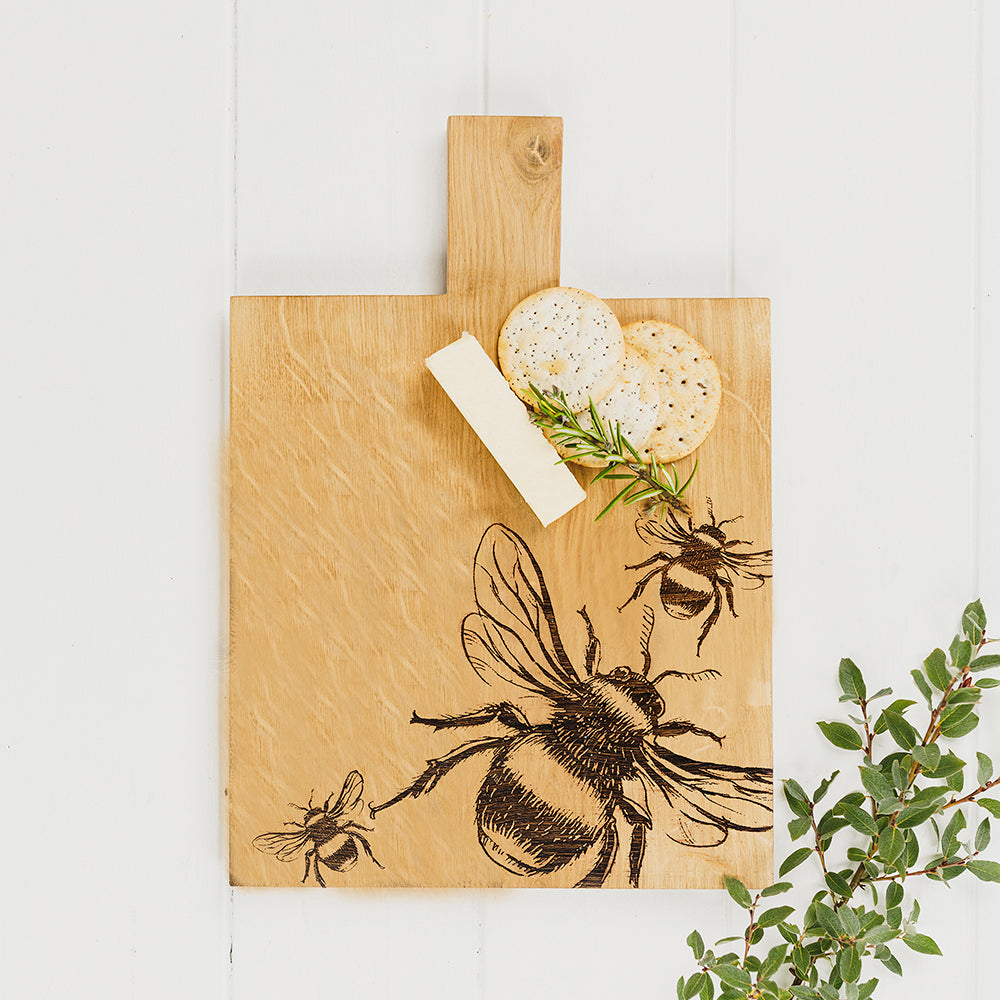 Featuring an engraved trio of bees design, this serving paddle is a great way to add country charm to your kitchen and dining table. Our hand crafted Scottish Oak serving paddle is generously sized, so you can prepare and present copious amounts of whatever you fancy - breads, cold meats, cheeses, nibbles, snacks or antipasti of any kind. A solid board you can use to create an impressive table presentation when entertaining at home