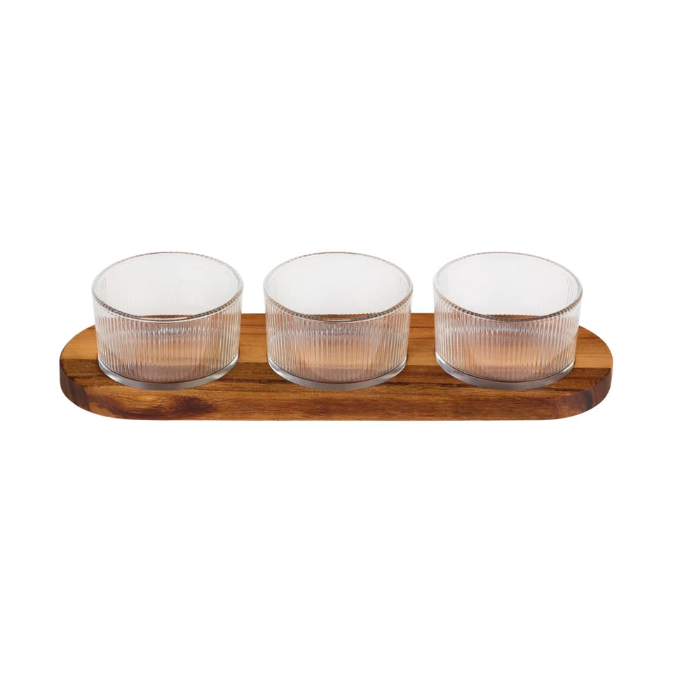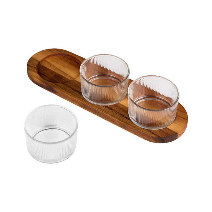 Serve in style with the Tala Set of 3 Ribbed Glass Pinch Pots with Acacia Serving Tray. Each 190ml pot is ideal for herbs, spices, dips, or nibbles—perfect for everything from seasoning while you cook to serving crisps and houmous when entertaining.