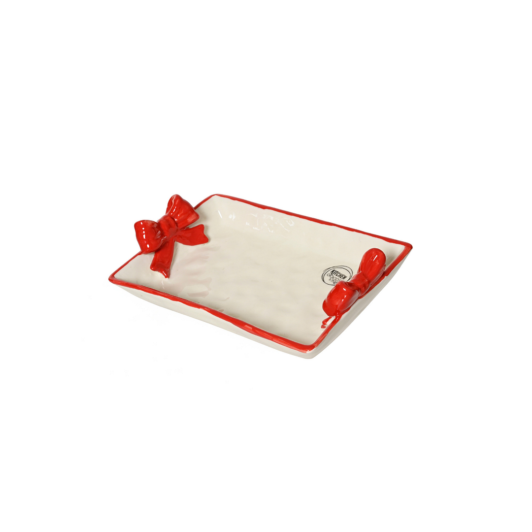 Kitchen Goods Serving Plate Red/White Add a touch of festive cheer to your holiday table with the Kitchen Goods Serving Plate in vibrant red and white. Perfectly crafted from durable dolomite, this plate is both sturdy and stylish for all your holiday entertaining needs. Whether you're serving appetizers, side dishes, or delectable desserts, this plate's ideal dimensions of 24 cm in length, 14.5 cm in width, and 6 cm in height make it the perfect centrepiece. Key Features: - Made from strong dolomite for long-lasting use - Festive red and white colour scheme to enhance your holiday decor - decorated with delicate bows for a charming finish - Size: 24 cm x 14.5 cm x 6 cm - Food safe, ensuring all your holiday treats are served with ease Enjoy effortless entertaining this holiday season. Invite your guests to indulge in your culinary creations, presented beautifully on this delightful serving plate.L.24cm x W.14.5cm x H.6cm