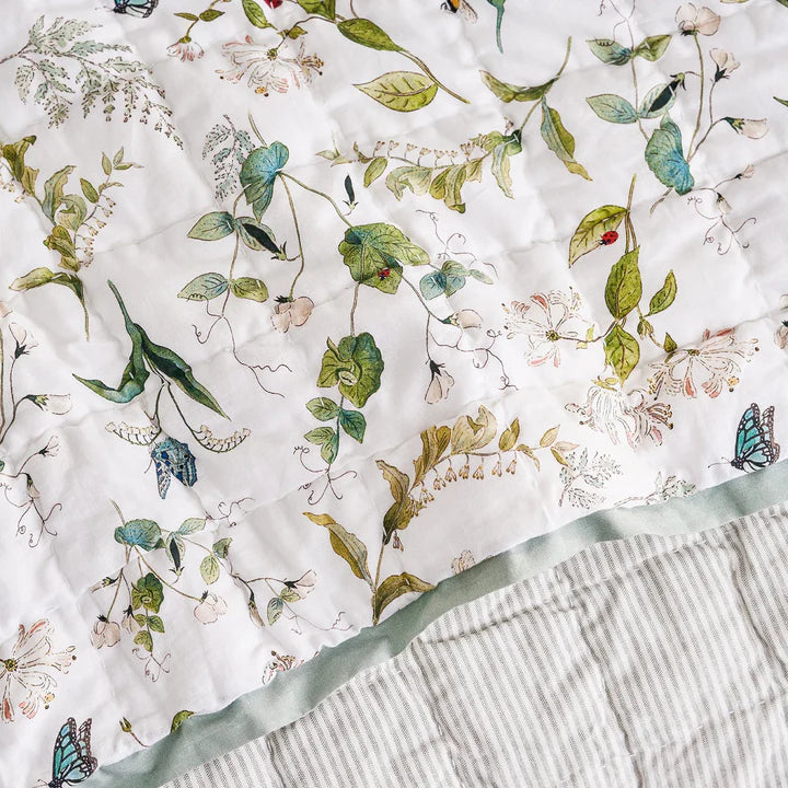 Wrap yourself in the softness of nature with this beautiful quilted throw that adds texture and warmth to any space. Sophie's Wild Floral design celebrates organic wildflowers and our beloved insects. Made from cotton, this quilted throw is perfect for layering on a sofa or bed and is ideal for all seasons. The reverse features our Stamford Stripe design, making a classic statement. Comes in a pull-string bag, offering an excellent home gift idea for floral lovers or gardeners.