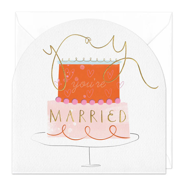 A whimsical tiered cake with playful decorations marks the joyous occasion of marriage. This card is a delightful way to celebrate the newlyweds' sweet beginning.