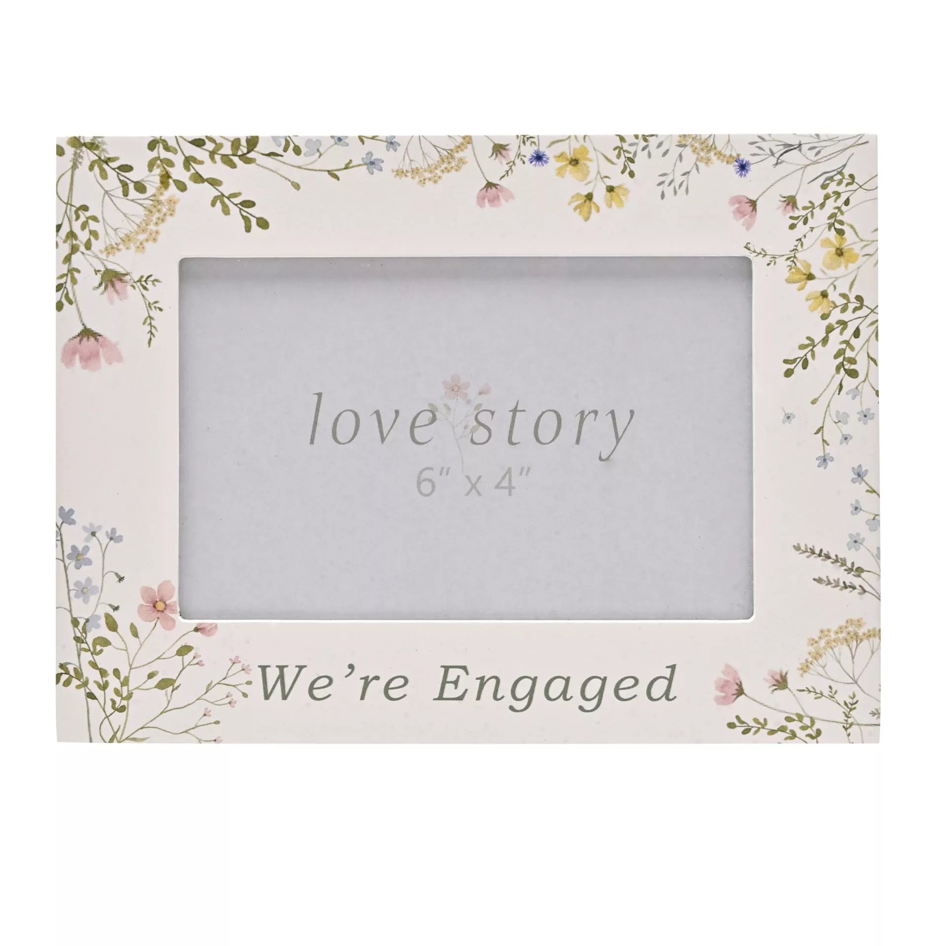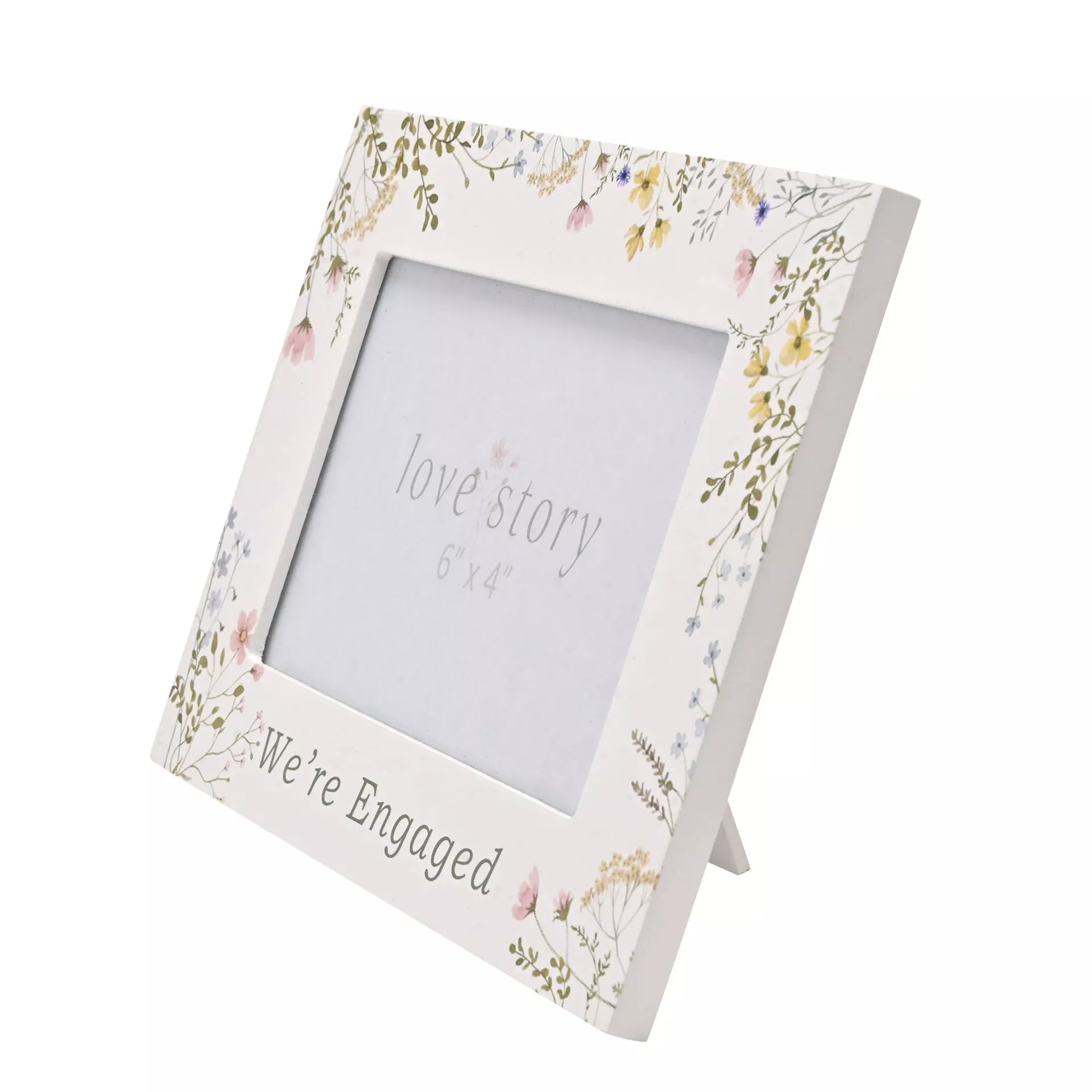 Love Story is a collection designed to celebrate the special moments shared between couples and their loved ones. Celebrate love's journey with the Love Story Wildflower Photo Frame - Enaged. This white freestanding frame, adorned with charming floral accents, is perfect for displaying a 4" x 6" photograph. An ideal gift for engagements.